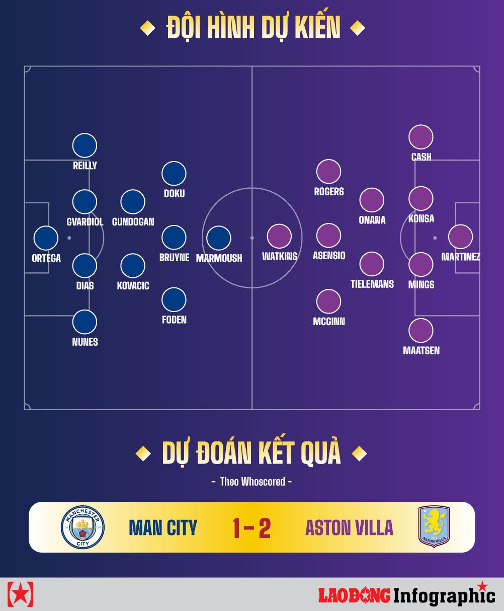 Trong thời điểm ngay hiện thời, Manchester City đang chọn đội hình trẻ trung và tràn trề sức khỏe và đa phần lực lượng, trong gần như ấy bao gồm sự góp mặt của gần như rường cột như Haaland, De Bruyne, và Alvarez. Sự bám chặt của gần như cầu thủ rường cột này giúp đội bóng hóa học vấn phải chăng số đông cuộc đấu béo, đi đôi thể hiện khả năng rạng ngời trong gần như gần như phút giây kiên quyết. Ngược lại, Aston Villa lao vào cuộc đấu này cùng lực lượng vùa tiêu dùng để da công thi đấu cân nặng bằng hoặc nhưng mà thậm chí dẫn mang đến bất ngờ bỗng dưng ngột khi bao gồm sự quay lại của 1 số ít rường cột lạ lùng quan trọng như Digne hay Luiz.